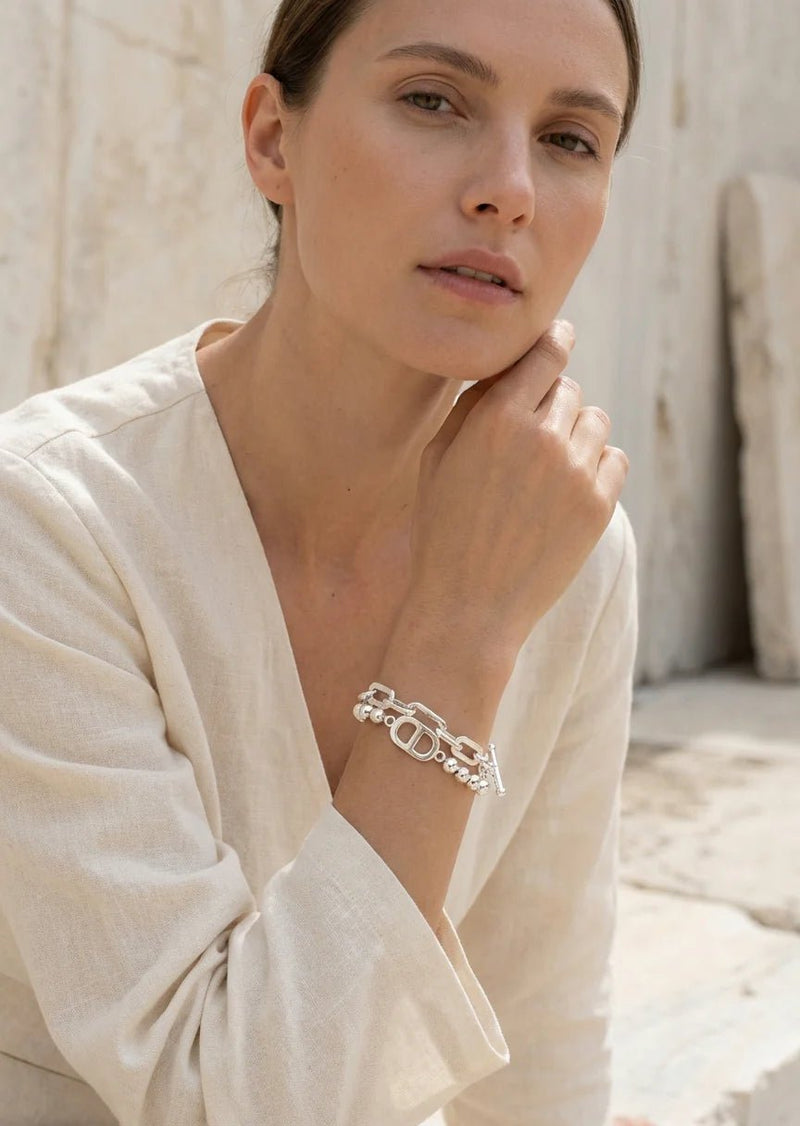 Silver chain and ball T-bar bracelet with link design