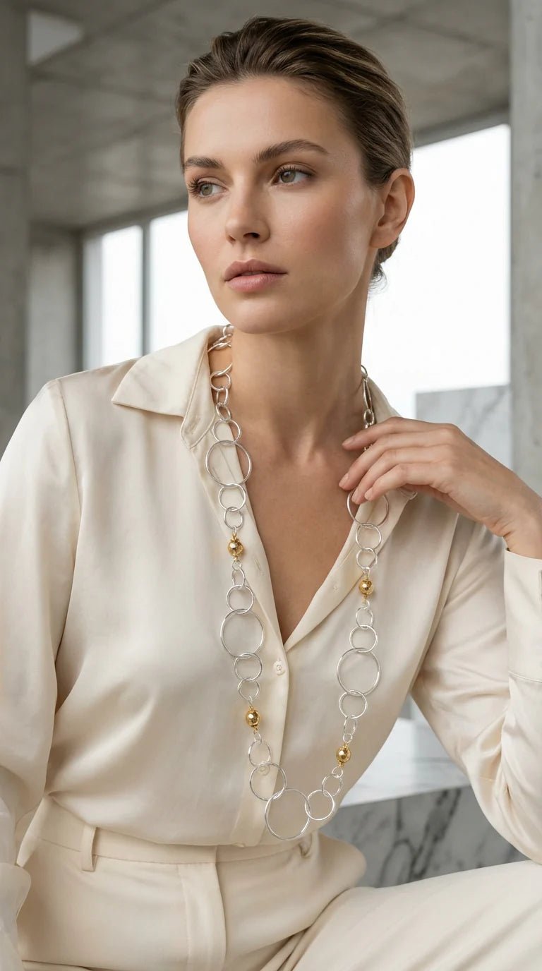 Long silver loop necklace with gold bead design