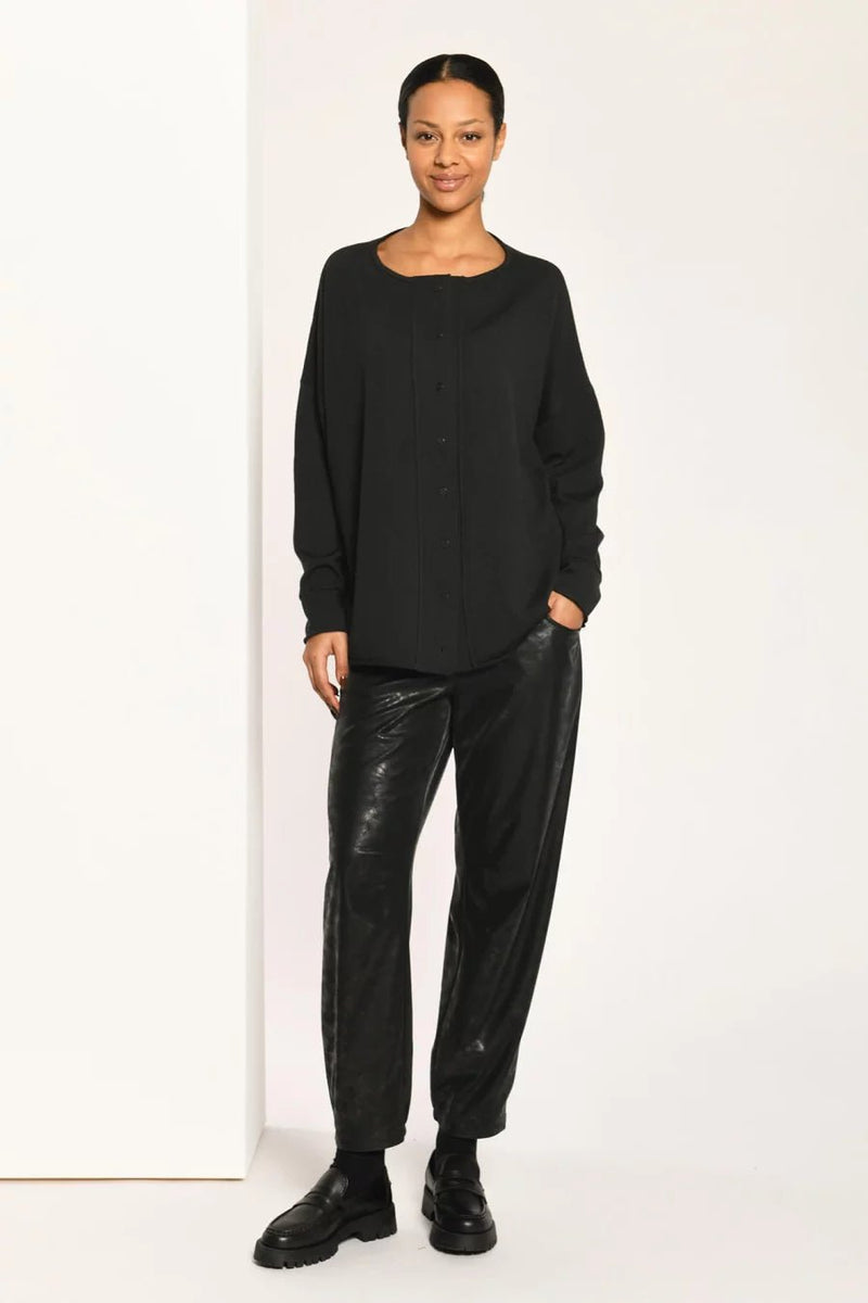 Elevate your style with the Vetono Round Shape Trouser in Black. These leather-look, straight-leg trousers feature stretch fabric for comfort and side pockets for practicality. Designed to flatter and move with you, they combine edgy sophistication with everyday ease, empowering you to step confidently into any occasion.